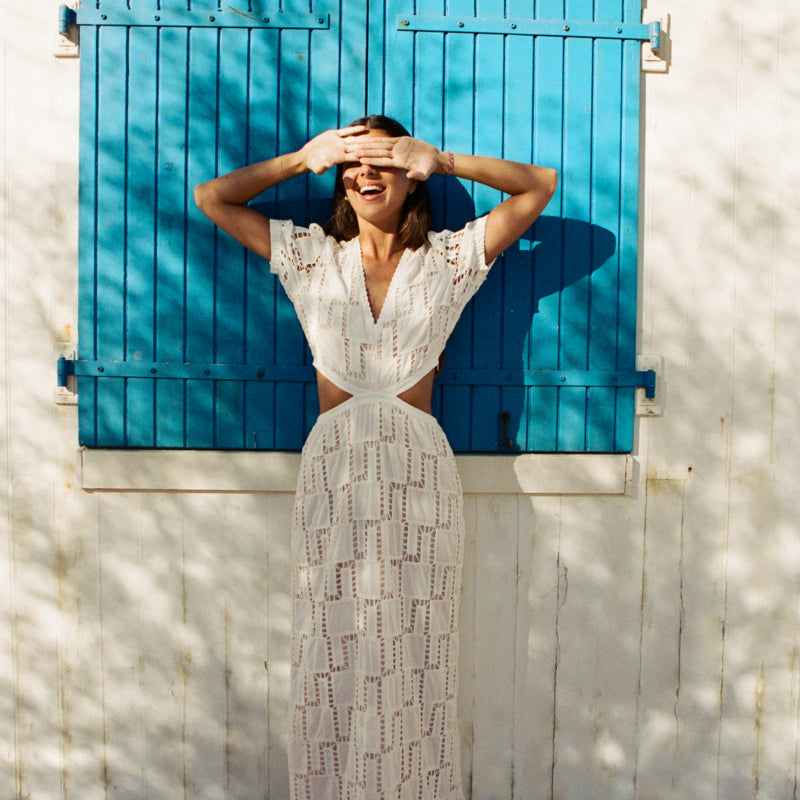 The AVA dress is simply stunning. Long and made of cotton, it's incredibly comfortable to wear. With slightly puffed, mid-length sleeves,allover eyelet embroidery, pleated shoulders for added volume, and a plunging V-neck, it will make a stunning statement on any occasion. The slightly flared silhouette won't restrict your movement but will enhance it.