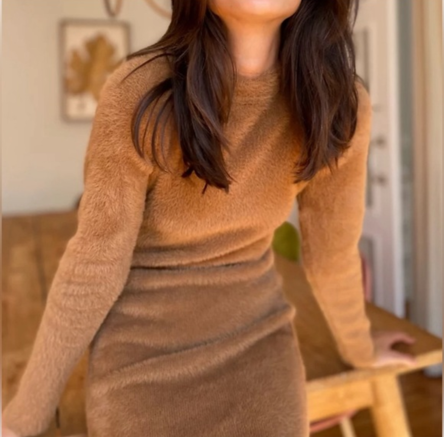 Long sleeve, crew neck bodycon super stretchy dress. Made with super soft and cozy fuzzy knit.