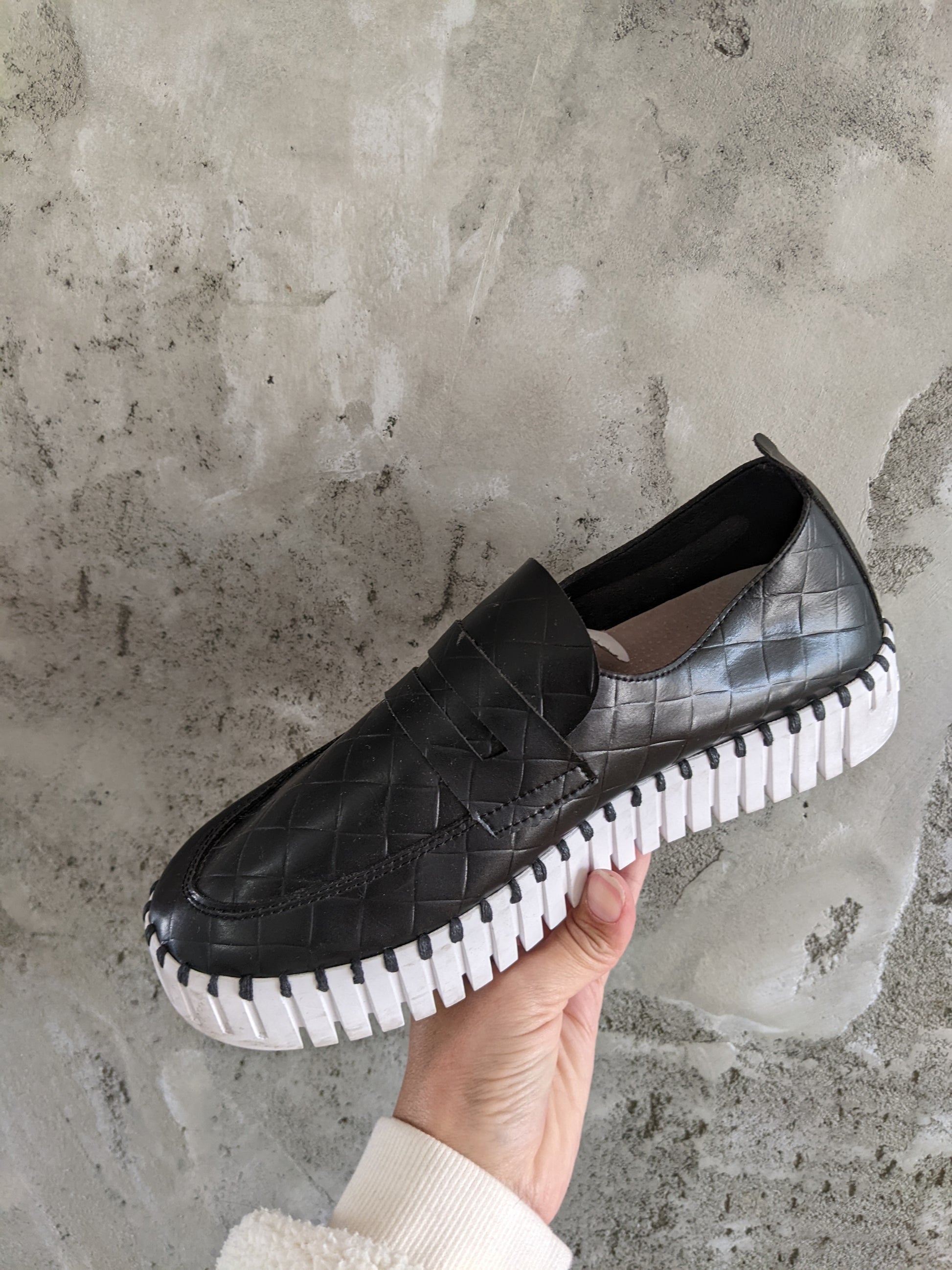The Ilse Jacobsen platform flats in black are a versatile choice for any occasion. They offer practicality and comfort with a stylish appearance. The natural rubber outsole makes them ideal for travel, while the updated design gives a modern twist on the classic penny-loafer. The soft microfiber linings and lightly cushioned footbed provide added comfort.