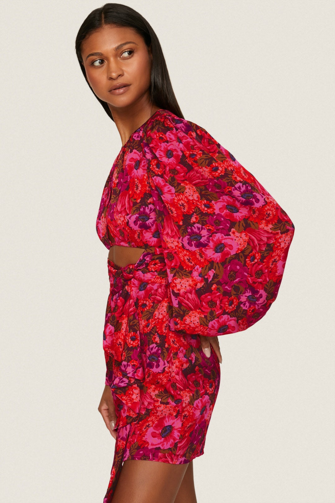 Command attention in this vibrant For Love & Lemons floral mini dress. The all-over floral print bursts with eye-catching hues, while the daring front cutout adds a touch of allure. Long sleeves with buttoned cuffs bring a polished feel to the silhouette, complemented by a hidden side zipper and back loop button closure. The partially lined design ensures comfort, while the flattering silhouette enhances your figure. Perfect for a night out, a special event, or a stylish date.