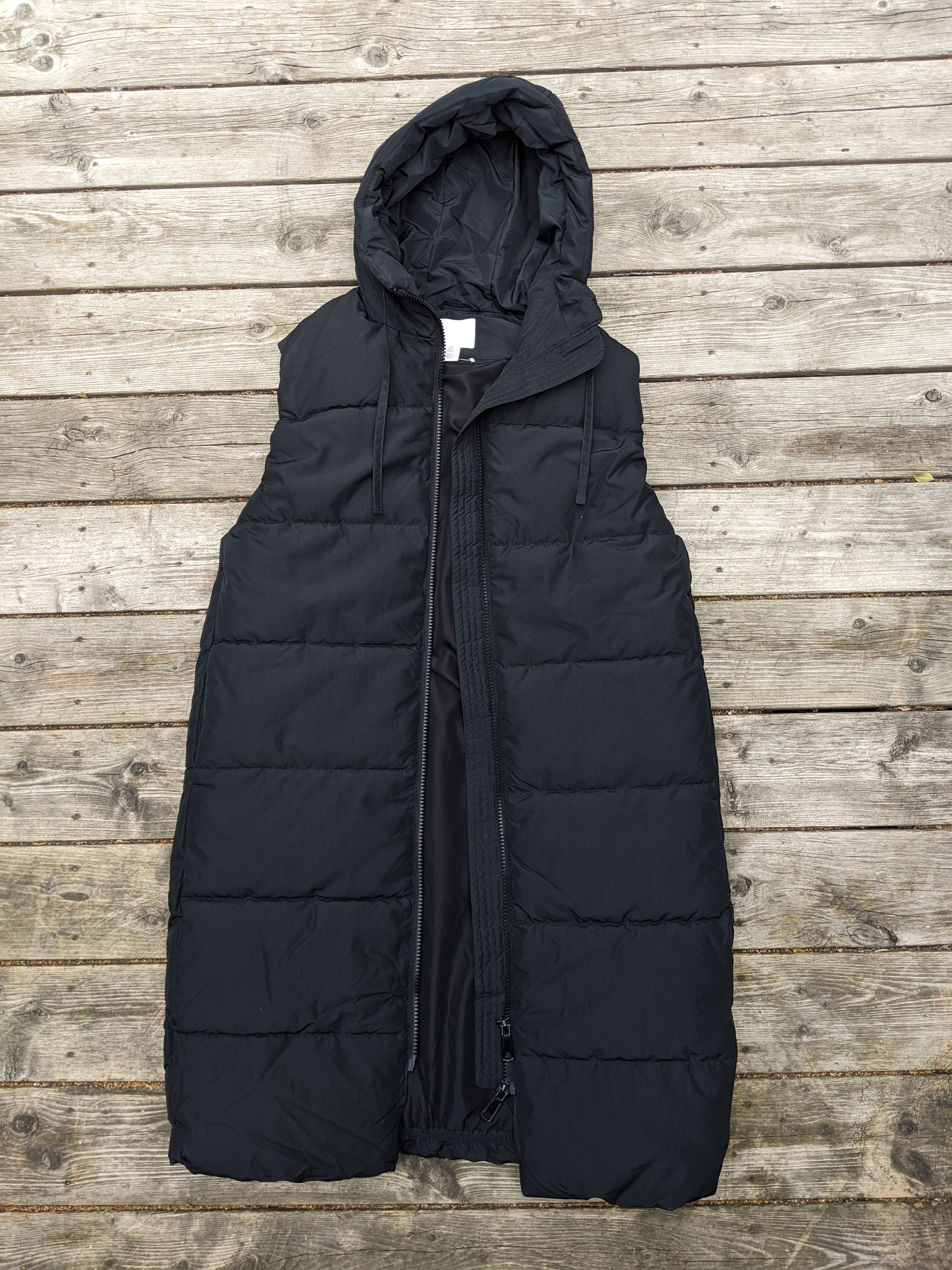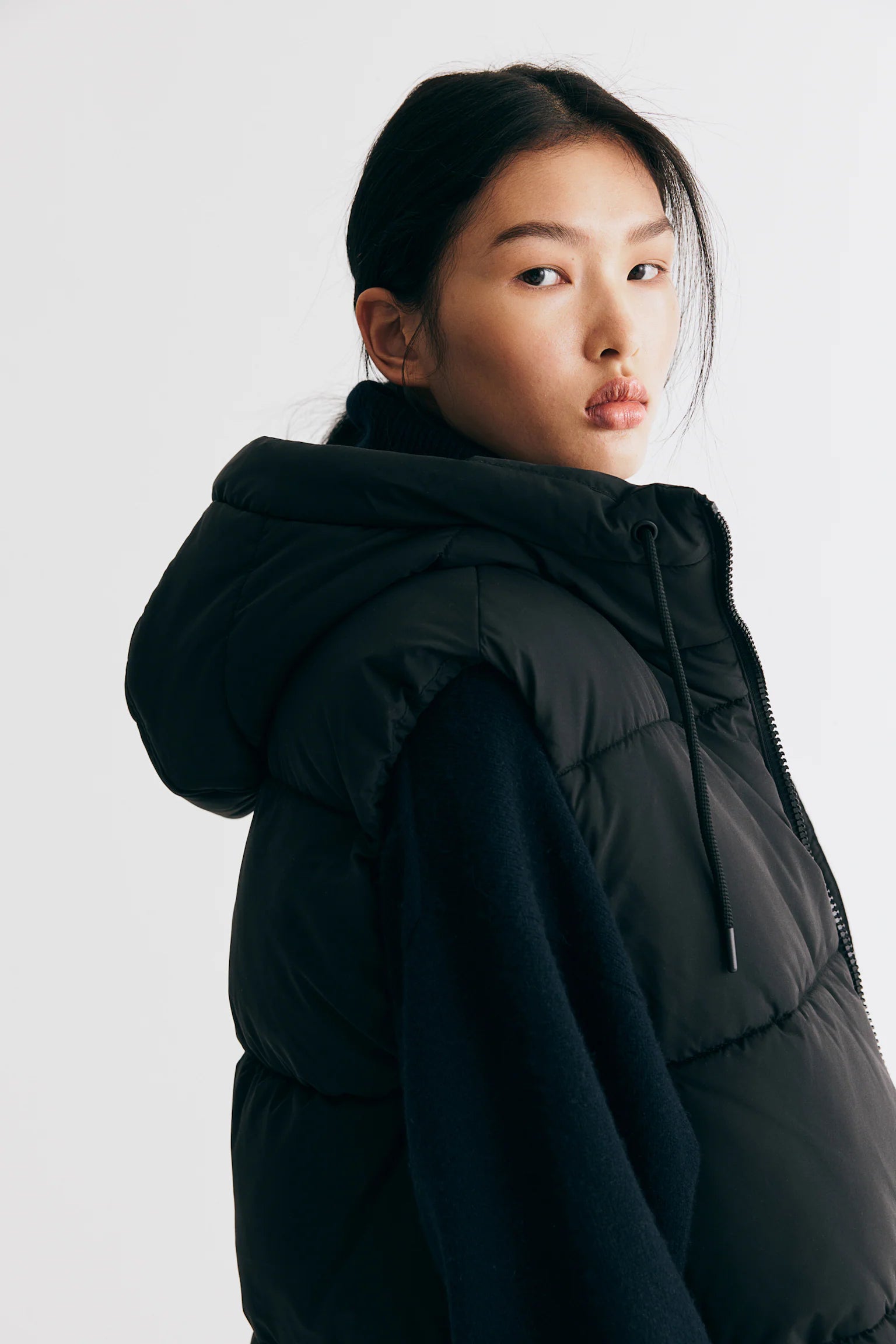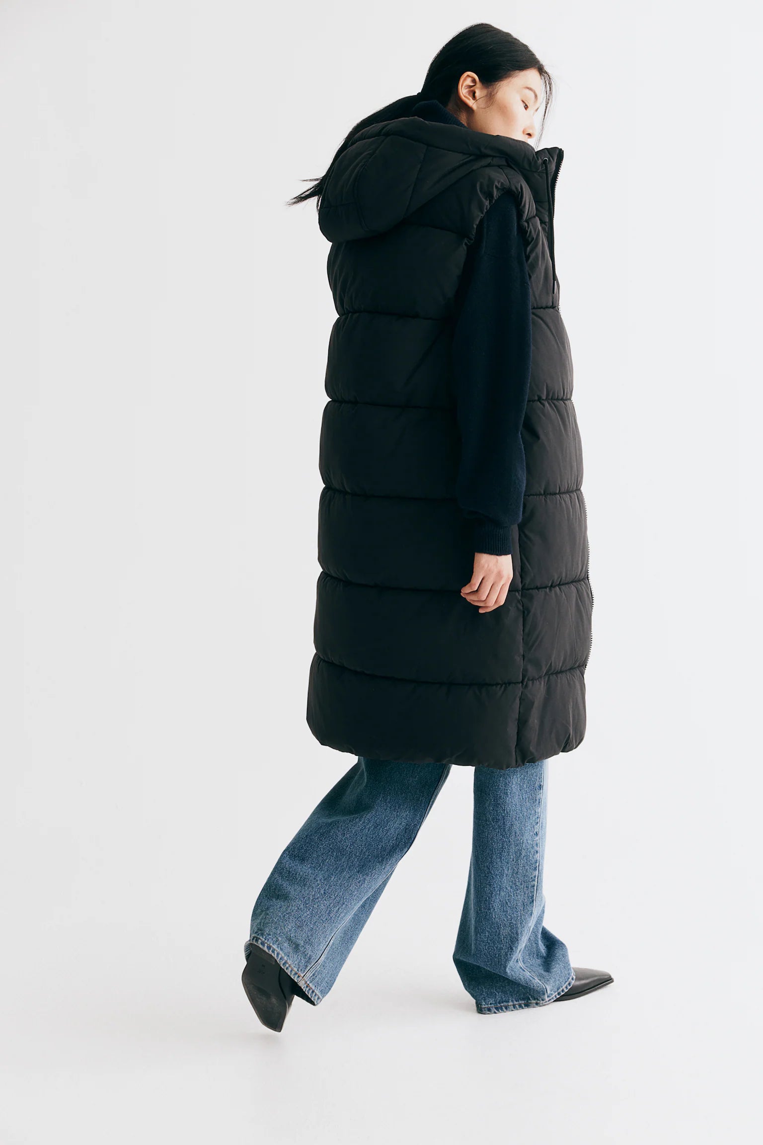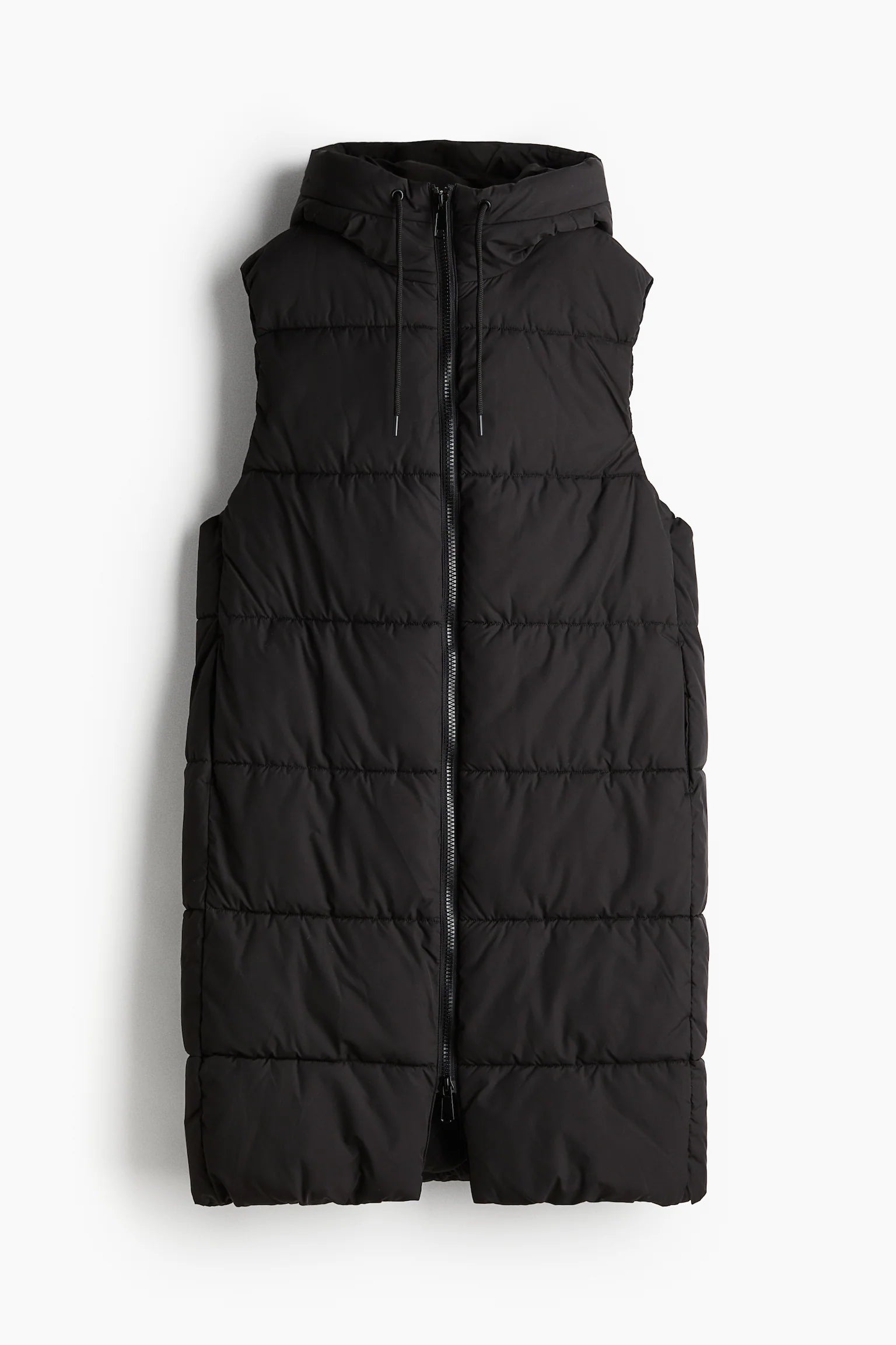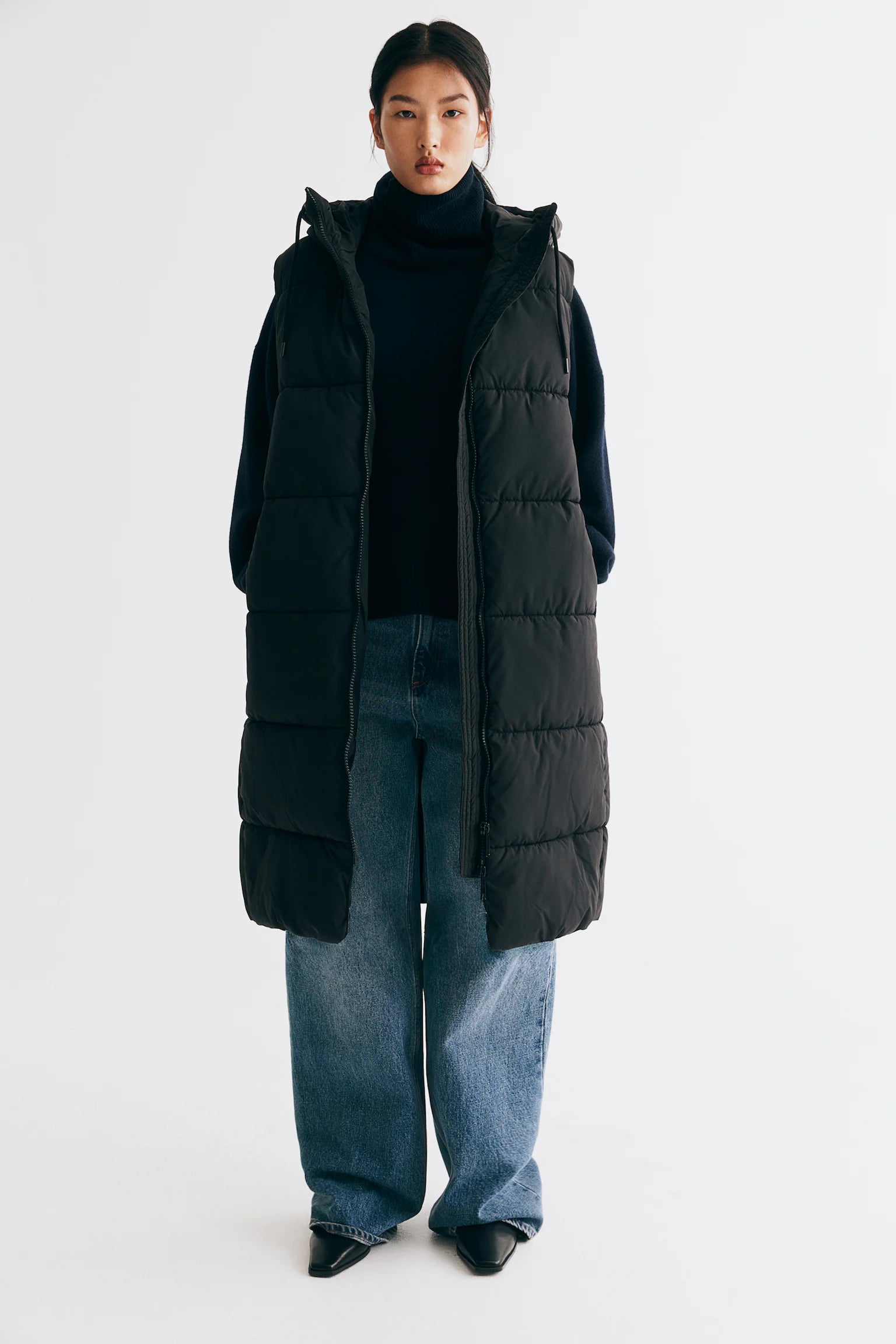 Relaxed-fit, knee-length padded vest in woven fabric with quilted seams. Drawstring hood, practical two-way zipper at front, and narrow, concealed elastic at armholes and hem. Forward-facing side seams with discreet pockets. Lined.