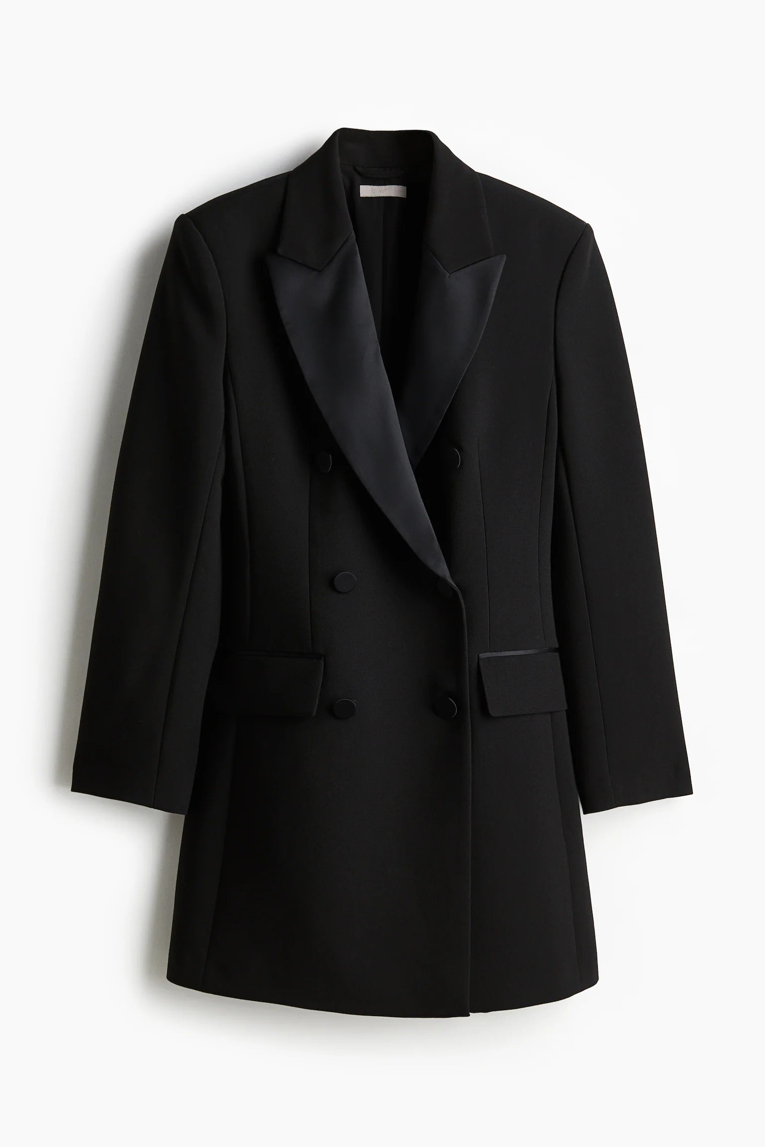 Short, double-breasted tuxedo jacket dress in twill. Pointed lapels in satin, covered buttons at front, and welt front pockets with flap. Shoulder pads and long sleeves. Lined.