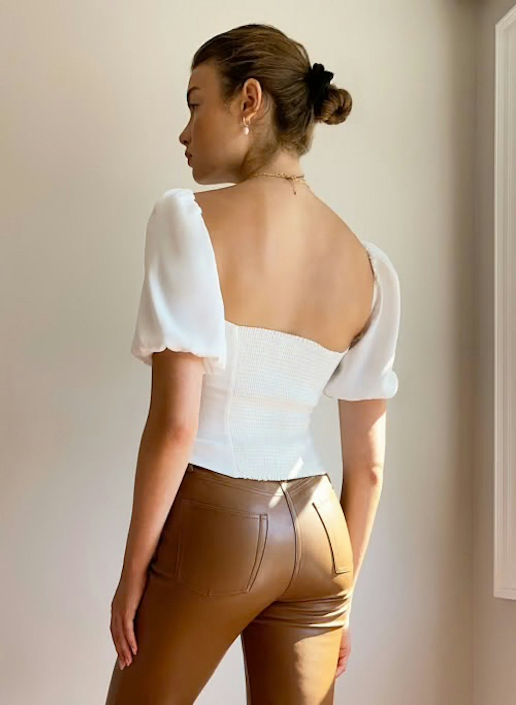 This is a short-sleeve bustier blouse with a sweetheart neckline, puff sleeves and smocked back panel for a more versatile fit. It's cut from ReCrepe™, lightweight, drapey crepe fabric made with LENZING™ ECOVERO™ Viscose — responsibly sourced wood-based fibres produced through a process that reduces impact on forests, biodiversity and water supply.
