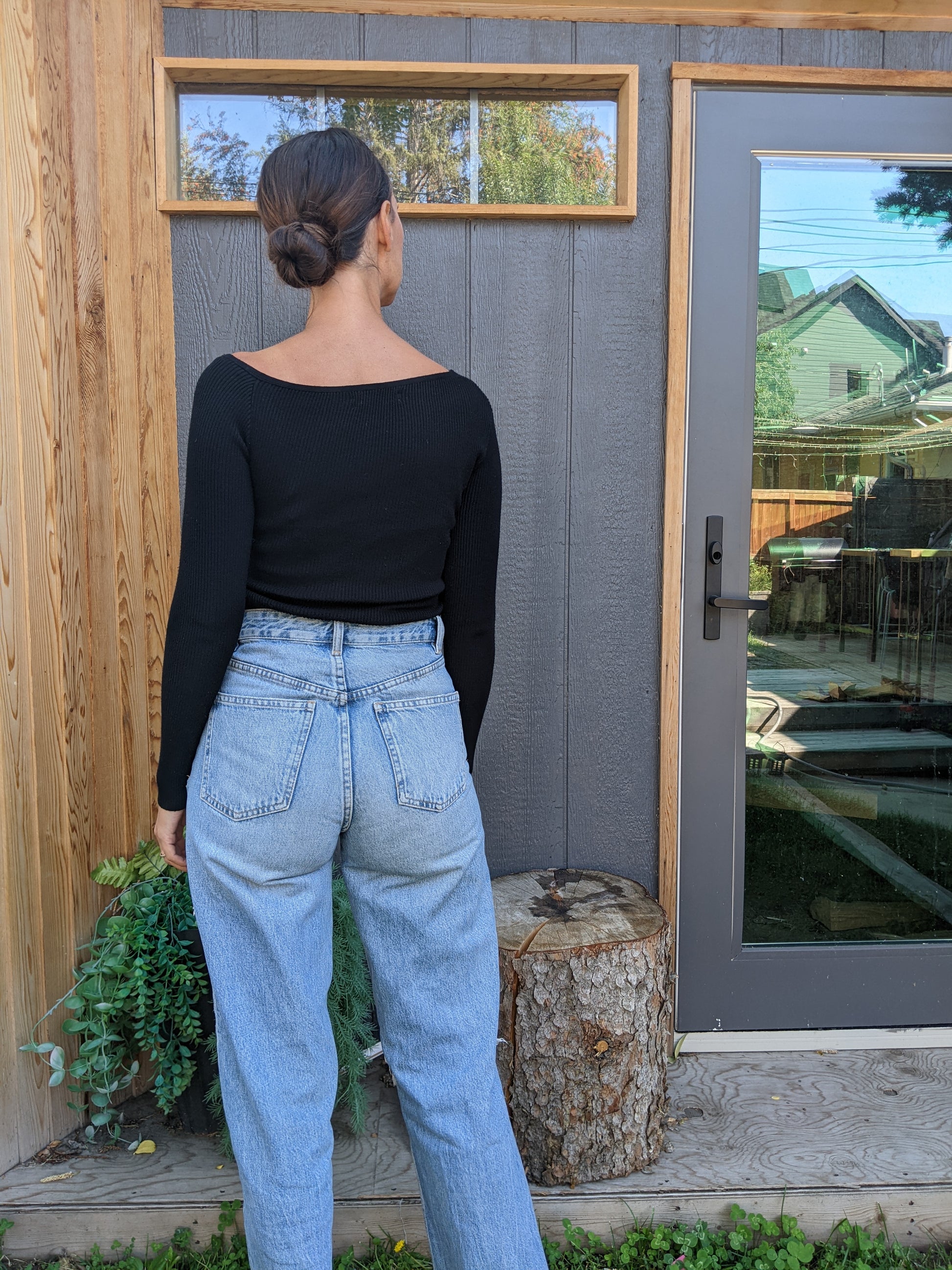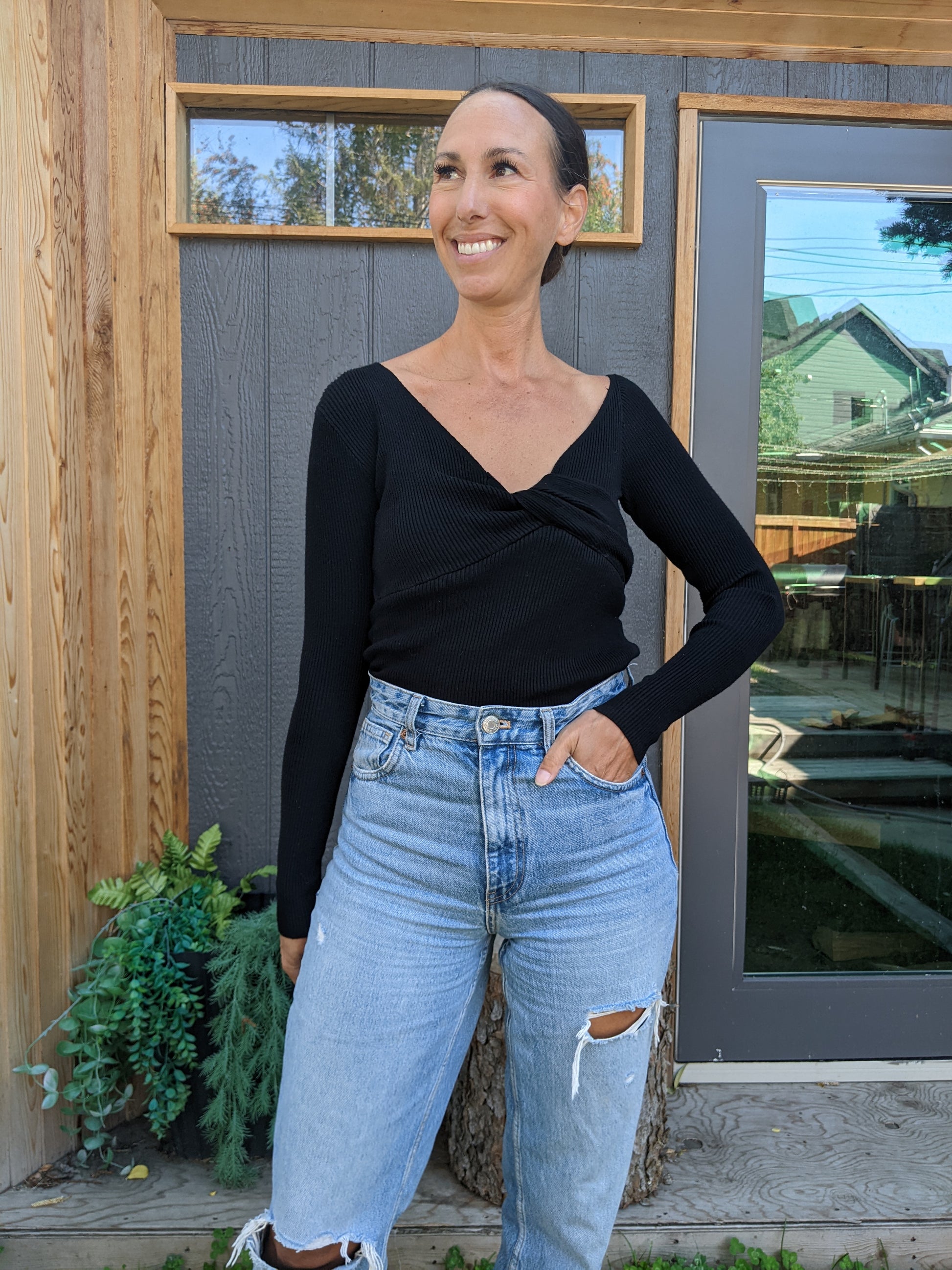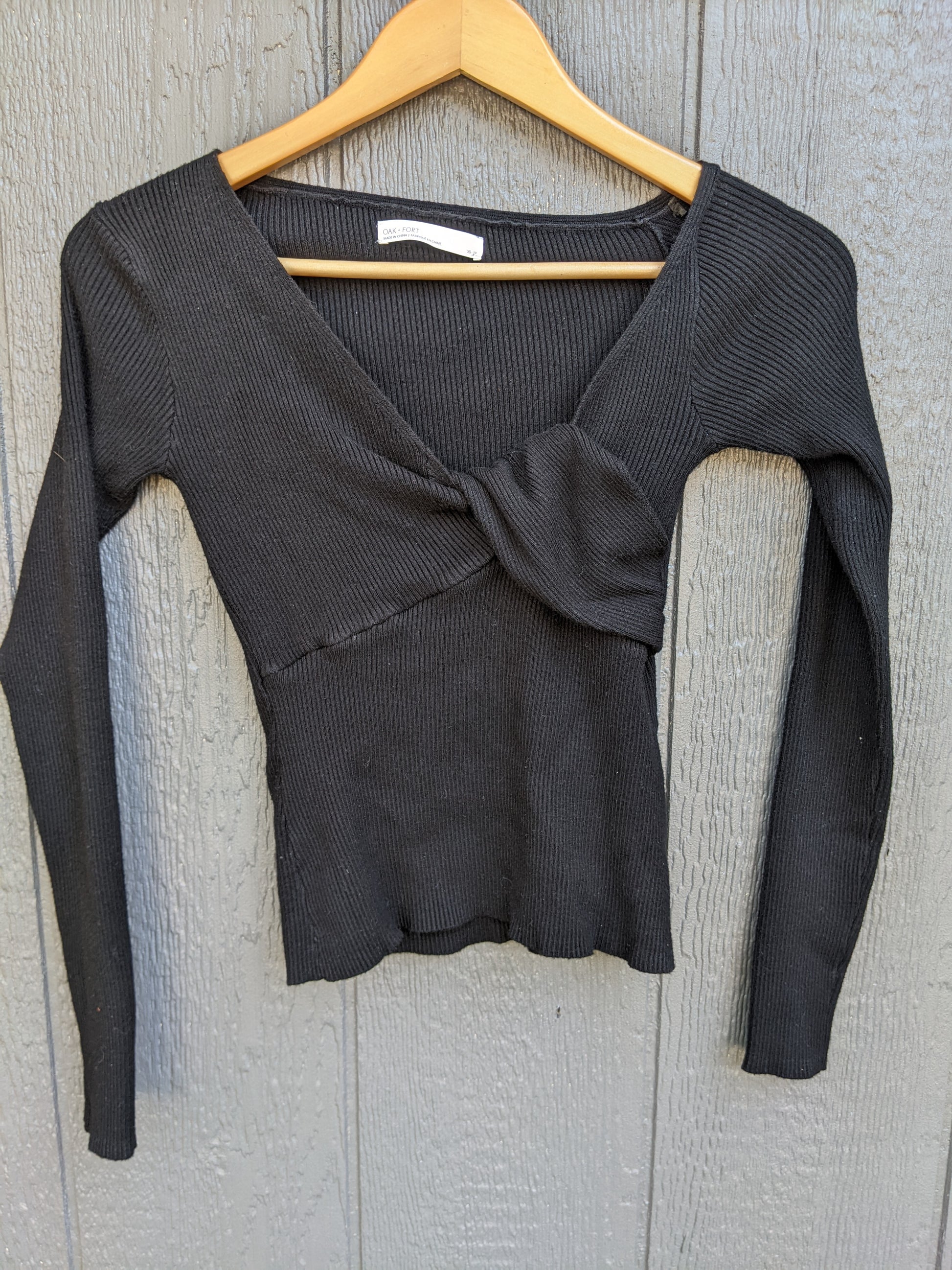 Oak + Fort twist V neck fitted ribbed sweater XS