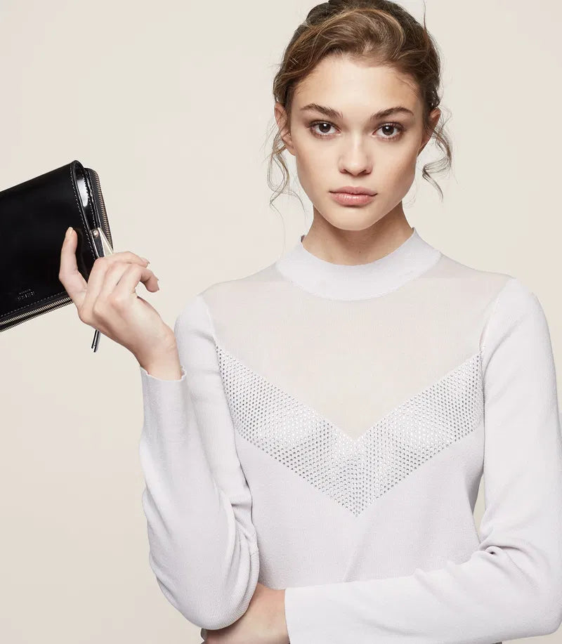 The powder-grey Tracey top is knitted with long sleeves and a close-fitting neckline. It features a subtly sheer top panel and it's embellished at the chest with metallic studs. Wear it to liven up a tailored trouser-black shoe combination.