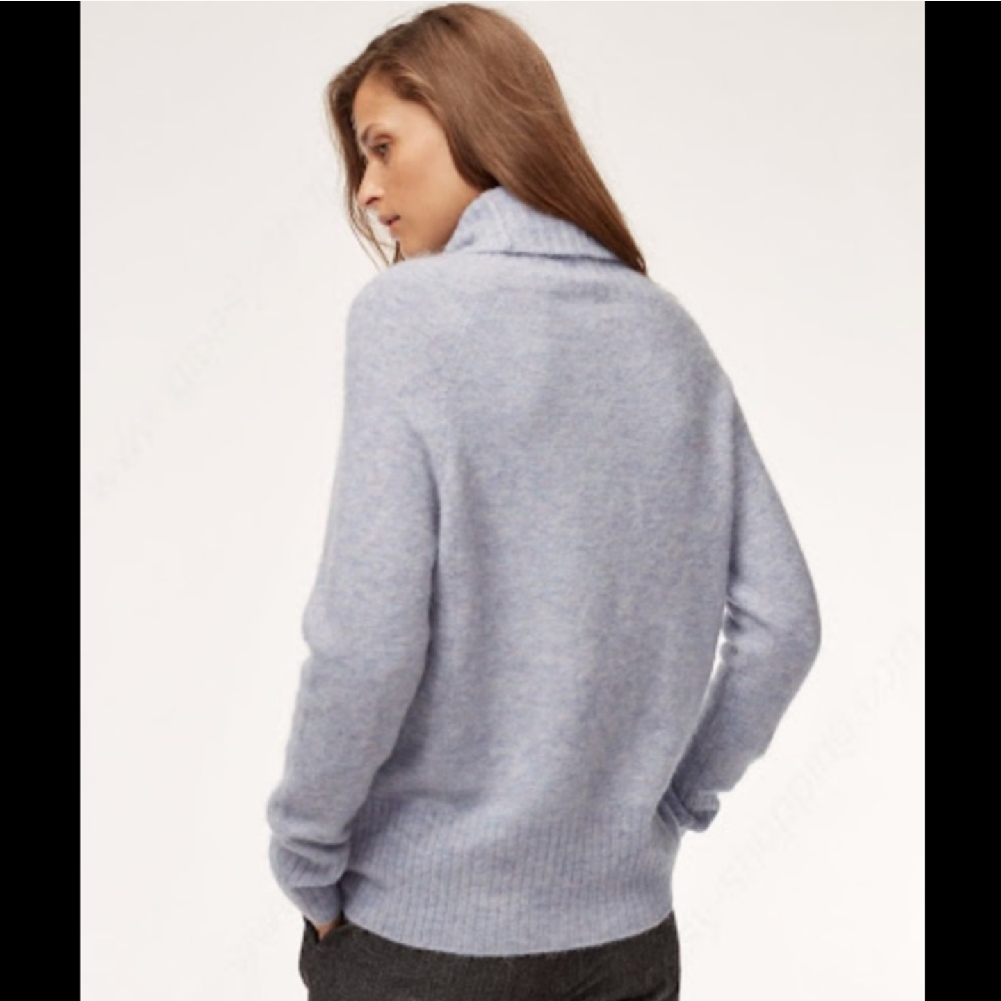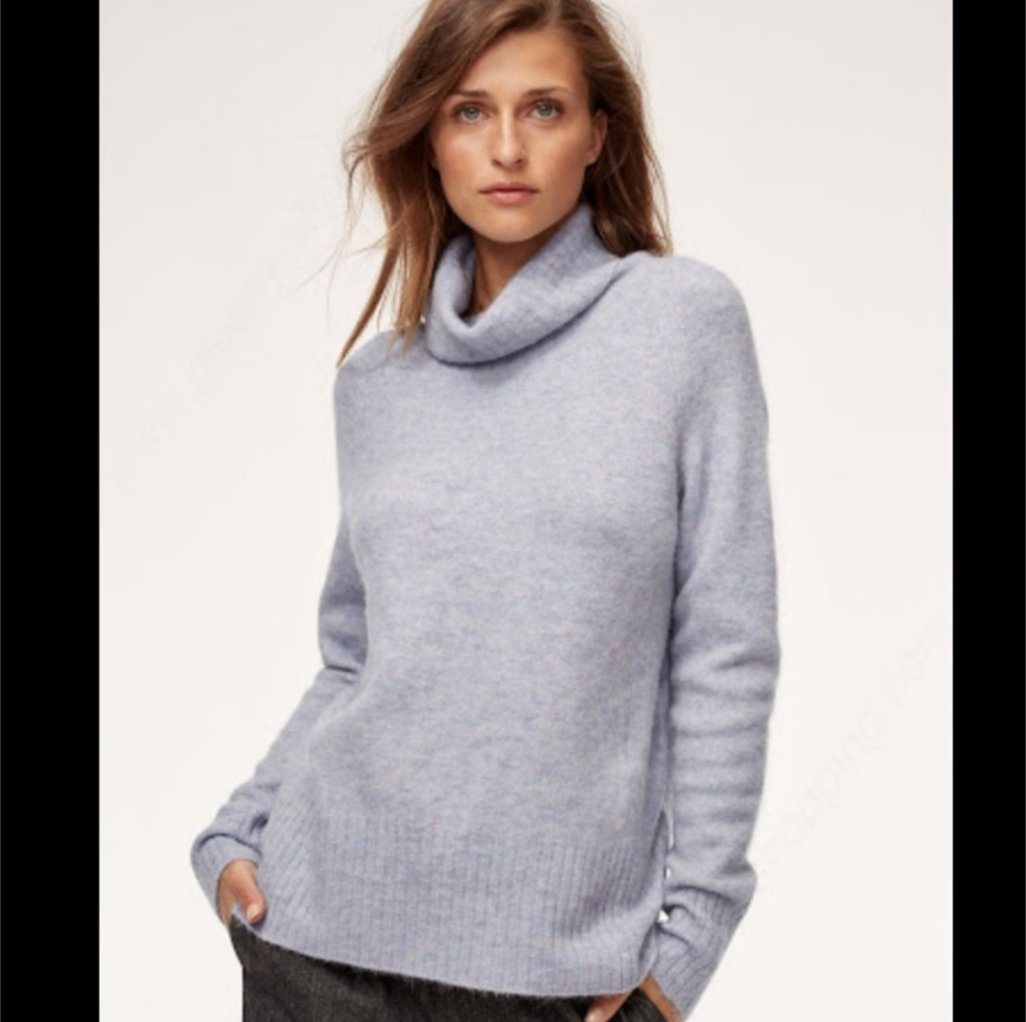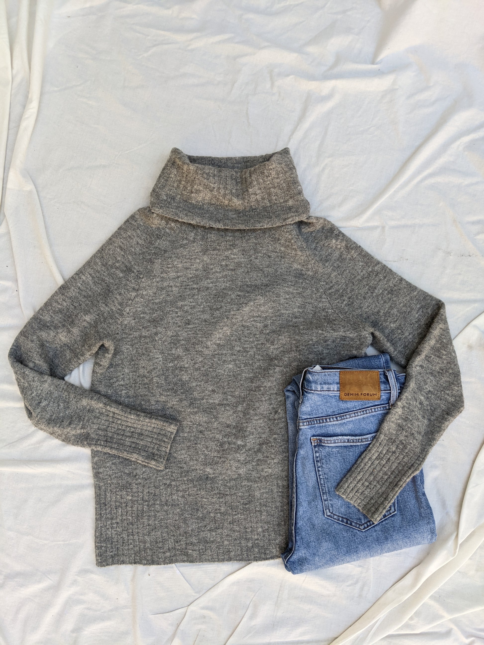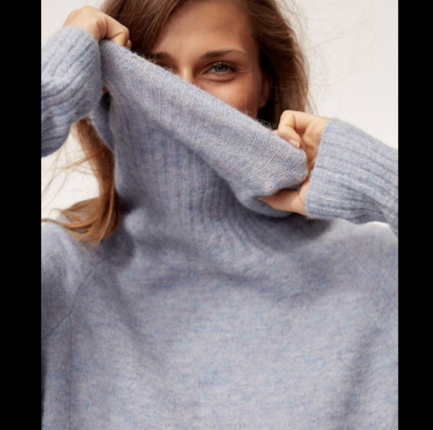 This is a fully fashioned turtleneck sweater with a relaxed fit. It's knit with warm and textural yarn from Italy. It's constructed with a Jersey stitch for a soft drape and a smooth, flat feel.