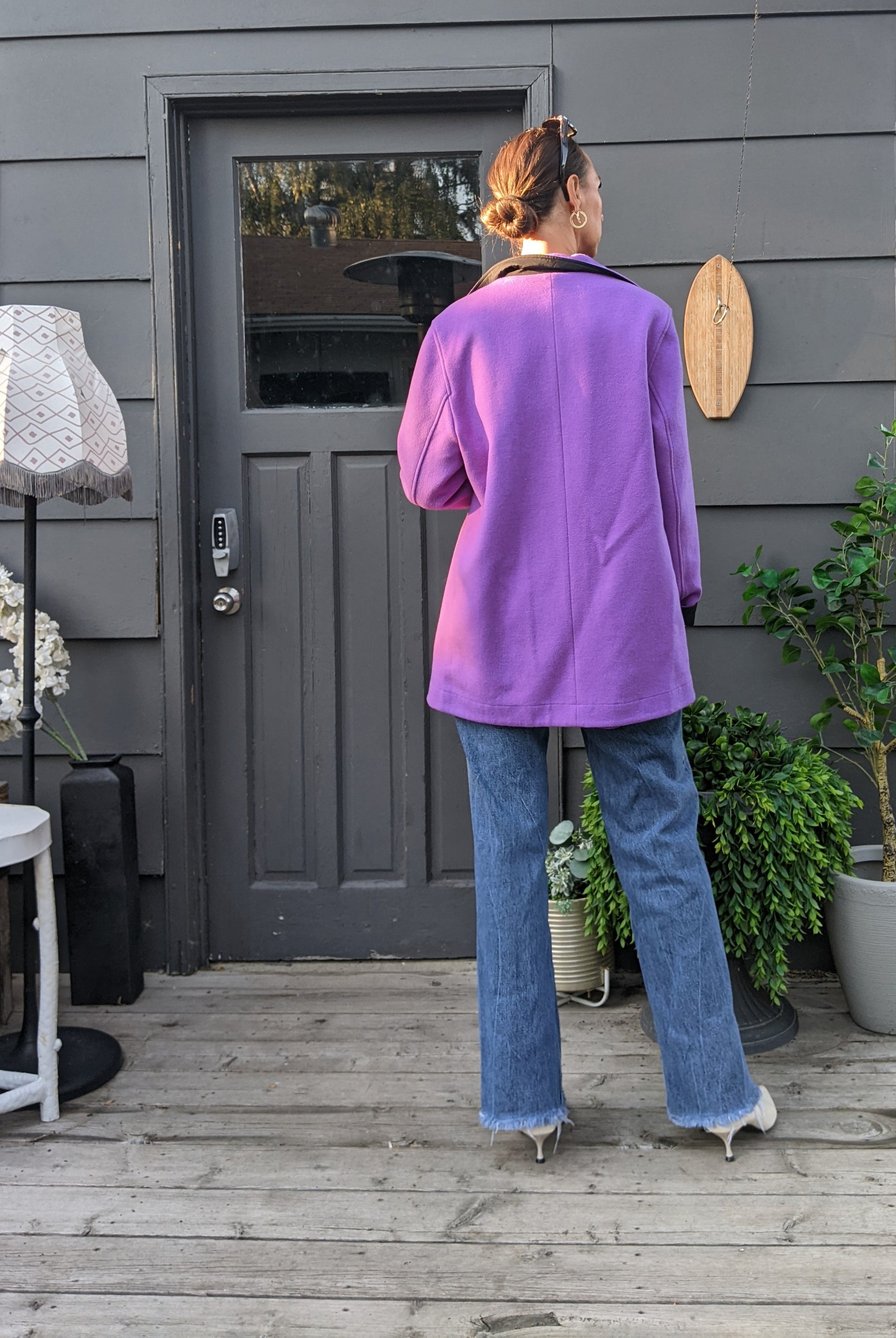 Gorgeous purple color jacket. Reversible to smooth black on other side. Both sides have pockets.